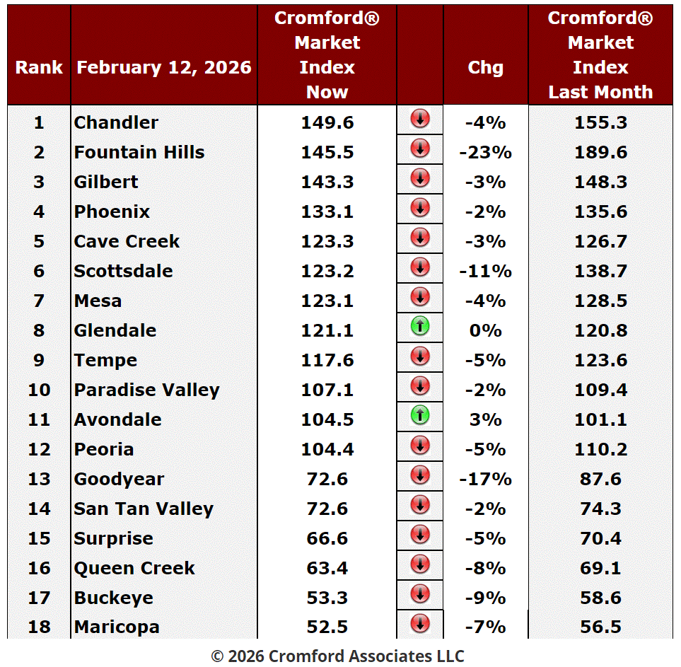Among the few bright spots for sellers, Avondale posted a modest 3 percent improvement, with Glendale slightly ahead. However, several cities, including Fountain Hills, Goodyear, and Scottsdale, recorded double-digit percentage moves in favor of buyers. Chandler moved to the top of the table after declining by just 4 percent, replacing Fountain Hills, which experienced a sharper downturn. These shifts highlight how relative performance can quickly reshuffle market rankings even when overall conditions weaken.