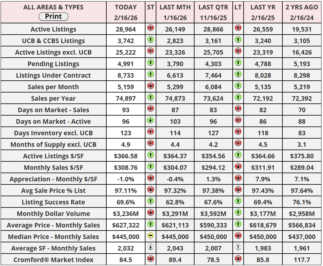 The fact that the market is still moving in favor of buyers after the Super Bowl is a concerning signal. In a typical strong season, active listings peak by mid February as rising demand absorbs available inventory. Last year, listings did not peak until late April, reflecting a weaker cycle. Early indications suggest 2026 is tracking a similar path, even though affordability has improved due to significantly lower mortgage rates compared with a year ago. This disconnect implies that interest rates alone are not enough to restore demand to normal seasonal strength.