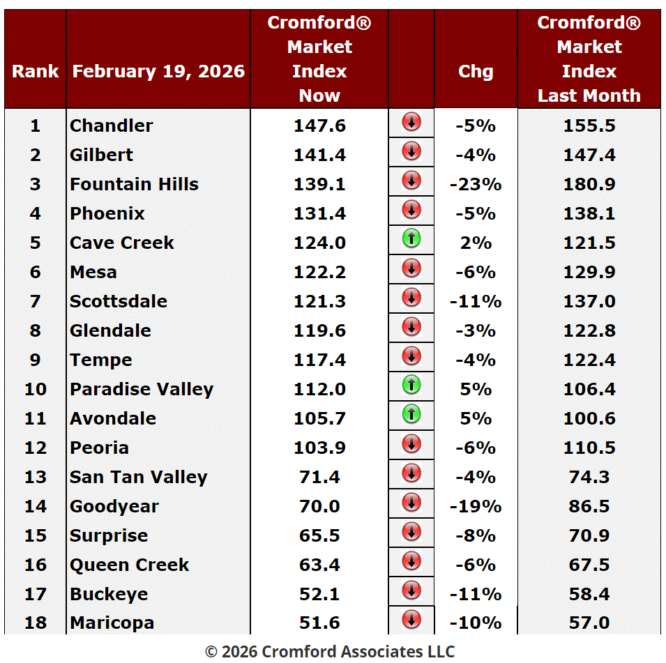 Avondale and Paradise Valley posted the strongest seller-friendly moves, each improving by 5 percent, while Cave Creek rose 2 percent. At the same time, Fountain Hills, Goodyear, Buckeye, Scottsdale, and Maricopa all saw double-digit percentage shifts in favor of buyers. Gilbert has joined Chandler at the top of the table despite posting a decline, largely because these centrally located cities face far less competition from new construction compared with outer areas such as Maricopa, Buckeye, Surprise, Queen Creek, Goodyear, and San Tan Valley, where supply pressures are heavier.
