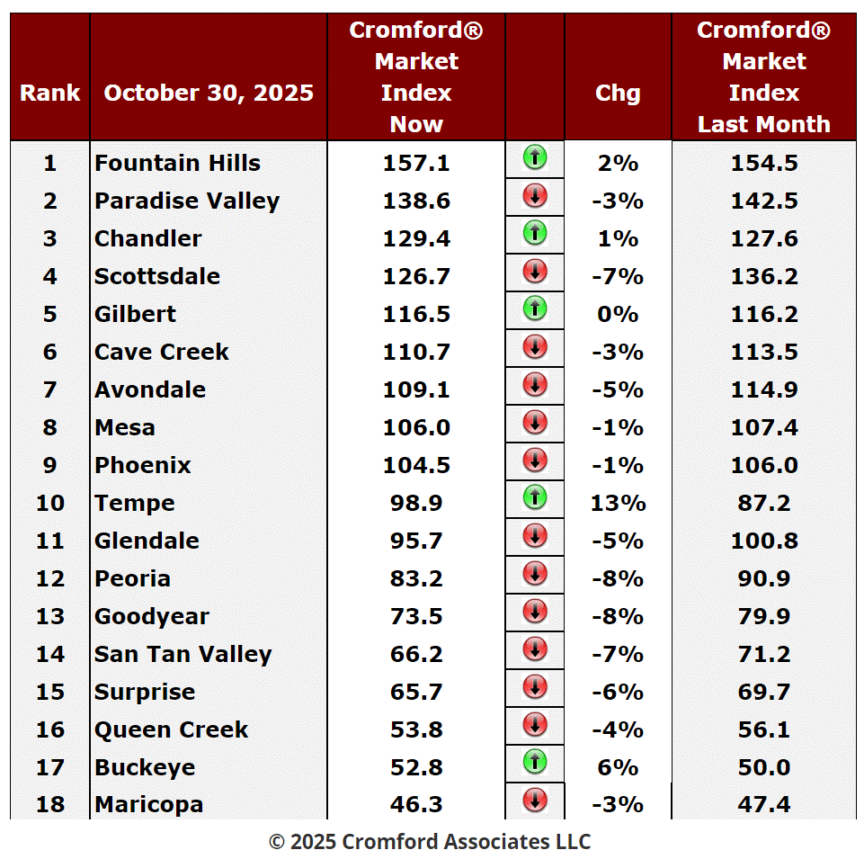 Month-over-month changes show Phoenix falling by 0.90%, three times weaker than the national average of -0.30%. This keeps Phoenix in 18th place out of 20 tracked metros. Meanwhile, Los Angeles declined by 1.02% and Portland by 1.05%, the worst in the country. On the flip side, Chicago rose modestly by 0.27%, the only city in the green.