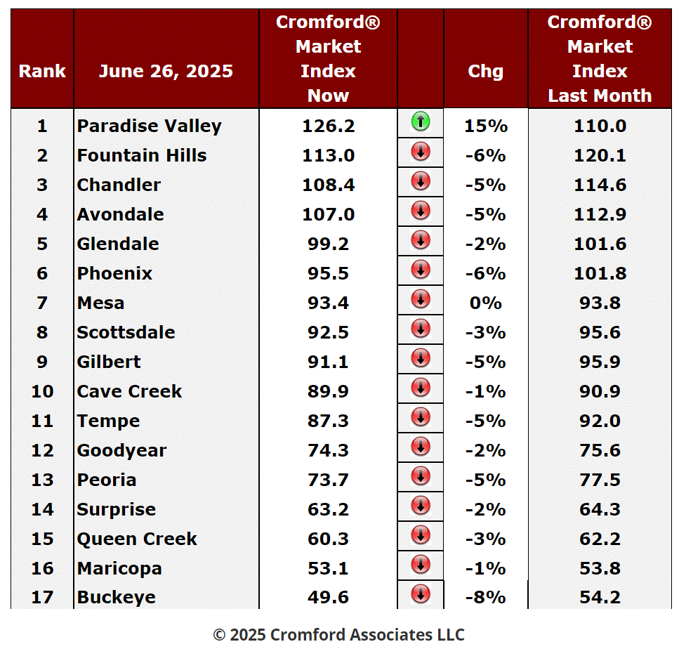 Of the 20 major cities tracked, 18 reported price increases over the month, while only Phoenix and Los Angeles showed declines. Several cities posted substantial gains, with Detroit, Boston, and New York leading the way, each with monthly increases above 1.2%. Nationally, the average monthly increase was +0.61%. Phoenix underperformed significantly, recording a slight -0.04% dip and slipping from 18th to 19th in the national ranking, narrowly beating only Los Angeles, which dropped -0.13%. LA’s weakness has been partly attributed to insurance fallout from devastating wildfires earlier in the year.