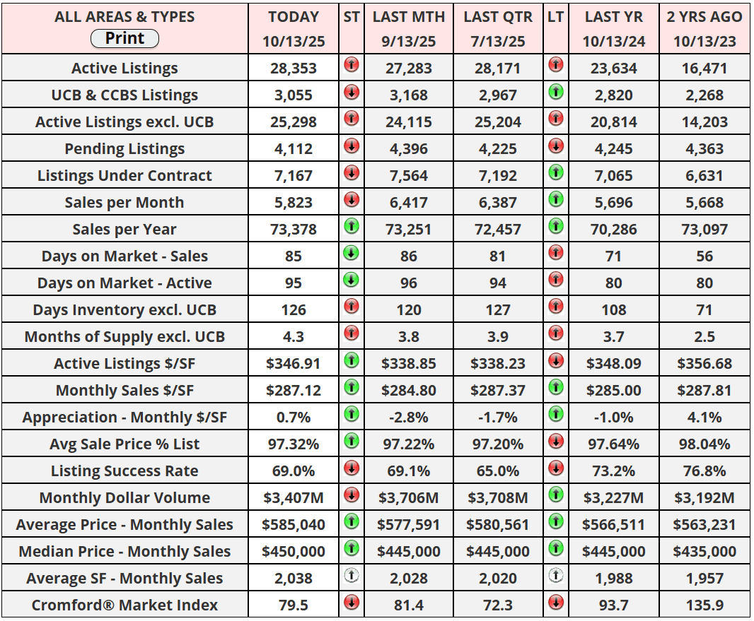 One of the biggest challenges for sellers is the rising number of active listings. Over the past week alone, listings without a contract rose by 1.85%, and total active inventory (including UCB/CCBS) is set to exceed 28,000. Stable interest rates in the 6.34%–6.38% range aren’t stimulating enough buyer activity to keep up with this growing supply. Entry-level home inventory far exceeds demand, placing first-time buyers in a powerful negotiation position, though many may lack the experience to capitalize without expert guidance. At the luxury end, high-net-worth individuals, bolstered by gains in stocks and crypto, are driving demand for now. However, any dip in financial markets could abruptly slow luxury home purchases. Homebuilders are already adjusting, pulling back on construction and quietly offering price cuts on move-in-ready homes. The rapid drop in builder stock prices this week may signal more pressure ahead.