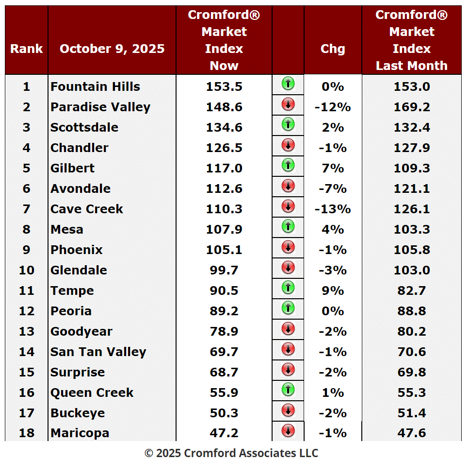 The Greater Phoenix housing market is shifting once again, and this week’s update brings several key changes. First, the list of major cities has expanded to 18, as Queen Creek has now been split into Queen Creek (ZIP 85142) and San Tan Valley (ZIPs 85140, 85143, 85144). San Tan Valley now stands as the most populous municipality in Pinal County, warranting its own analysis moving forward. Alongside that, red flags are increasing for sellers: 11 of the 18 tracked cities have moved in favor of buyers over the past month. The average change in the Cromford Market Index (CMI) was -1.1%, marking a reversal from last week’s slight gain. Buyer-favorable cities include Cave Creek, Paradise Valley, and Avondale, while Tempe and Gilbert were the only cities to show more than 5% positive movement for sellers.