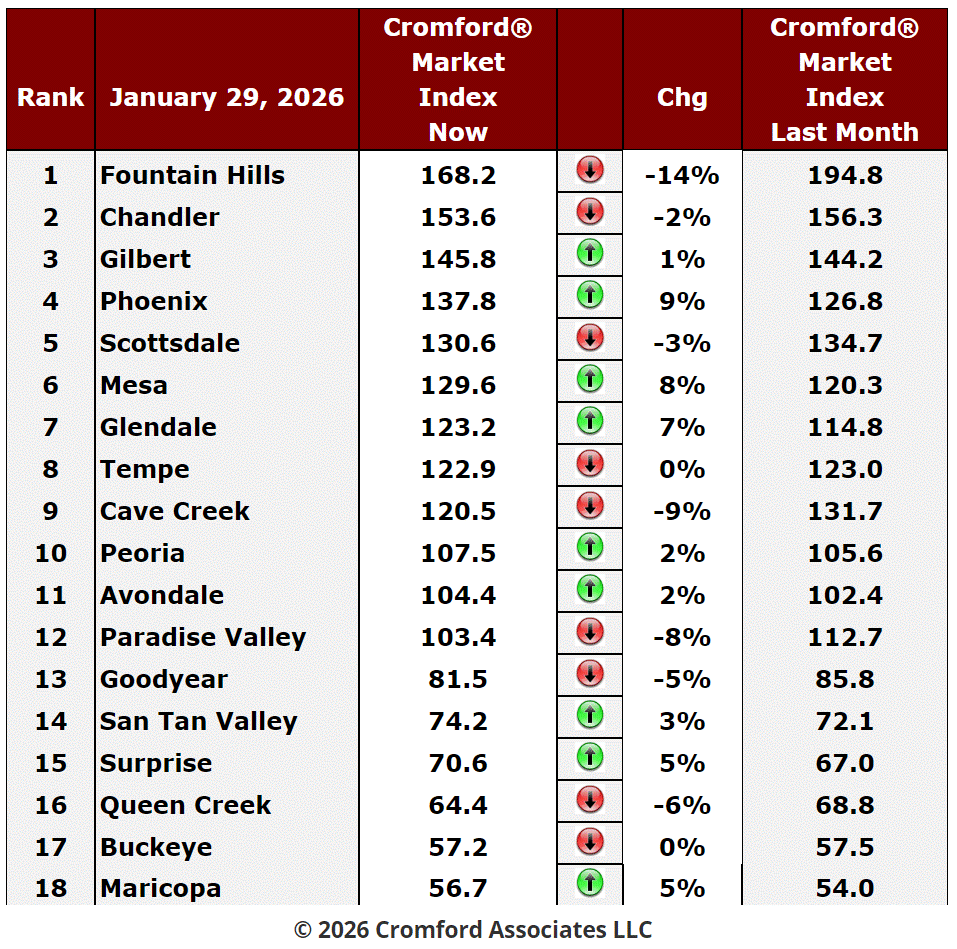 Anthem and Laveen stand out as the strongest movers in favor of sellers, showing clear improvements in market conditions. They are followed by Sun City, Gold Canyon, and Arizona City, all of which have also tilted in a seller-friendly direction. These gains point to localized tightening of supply or improved buyer activity, even while broader market conditions remain mixed.